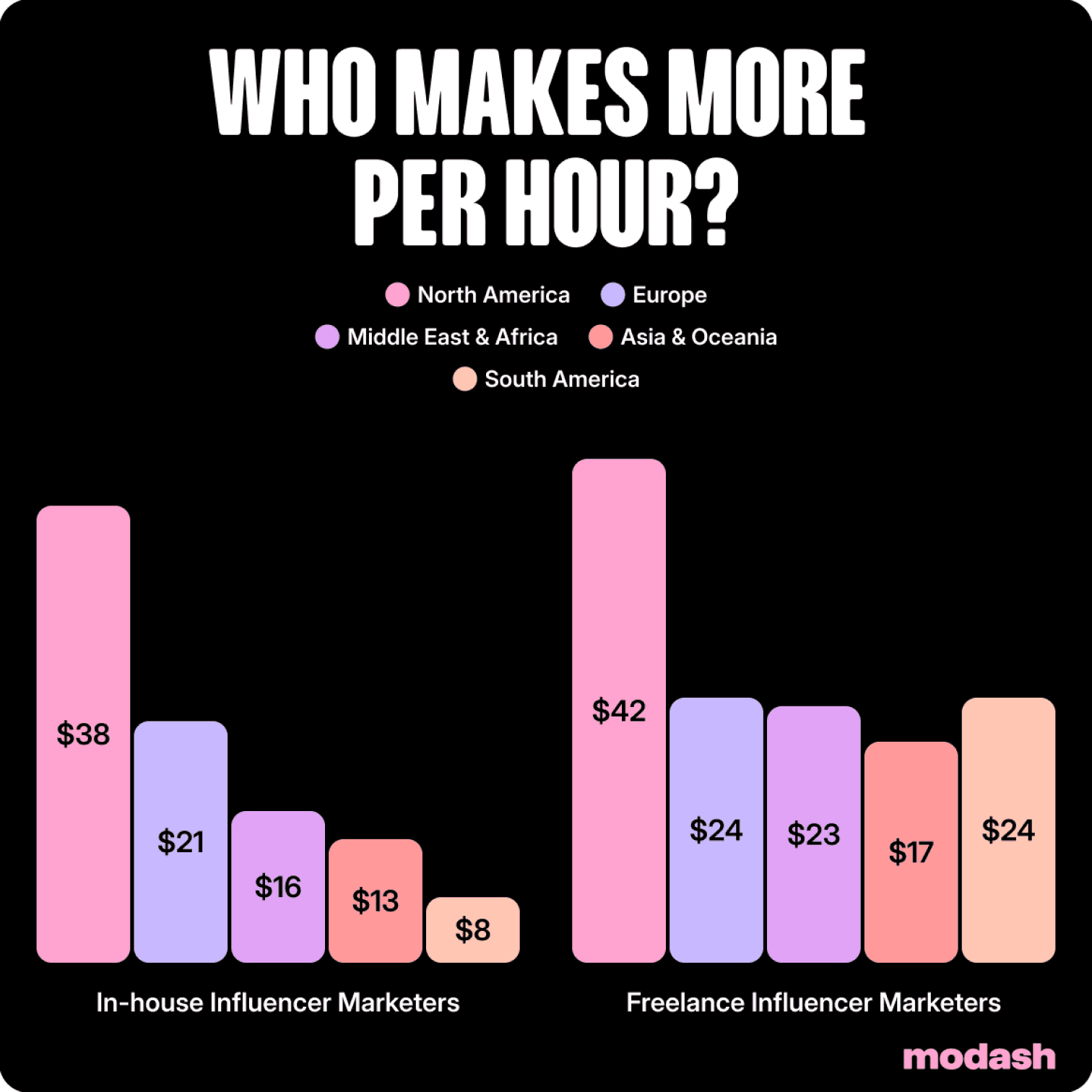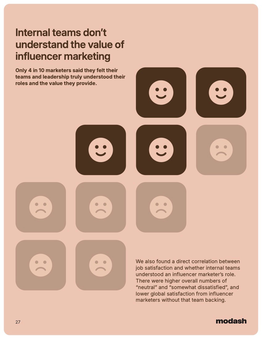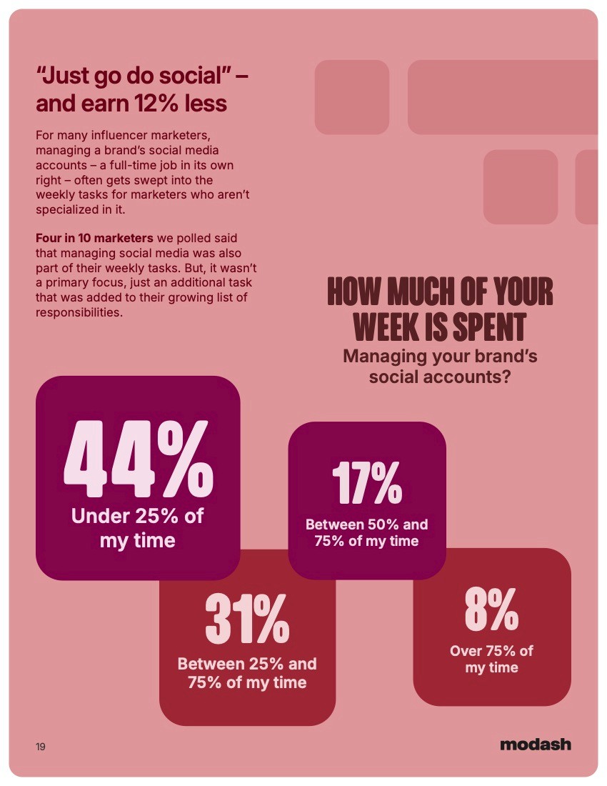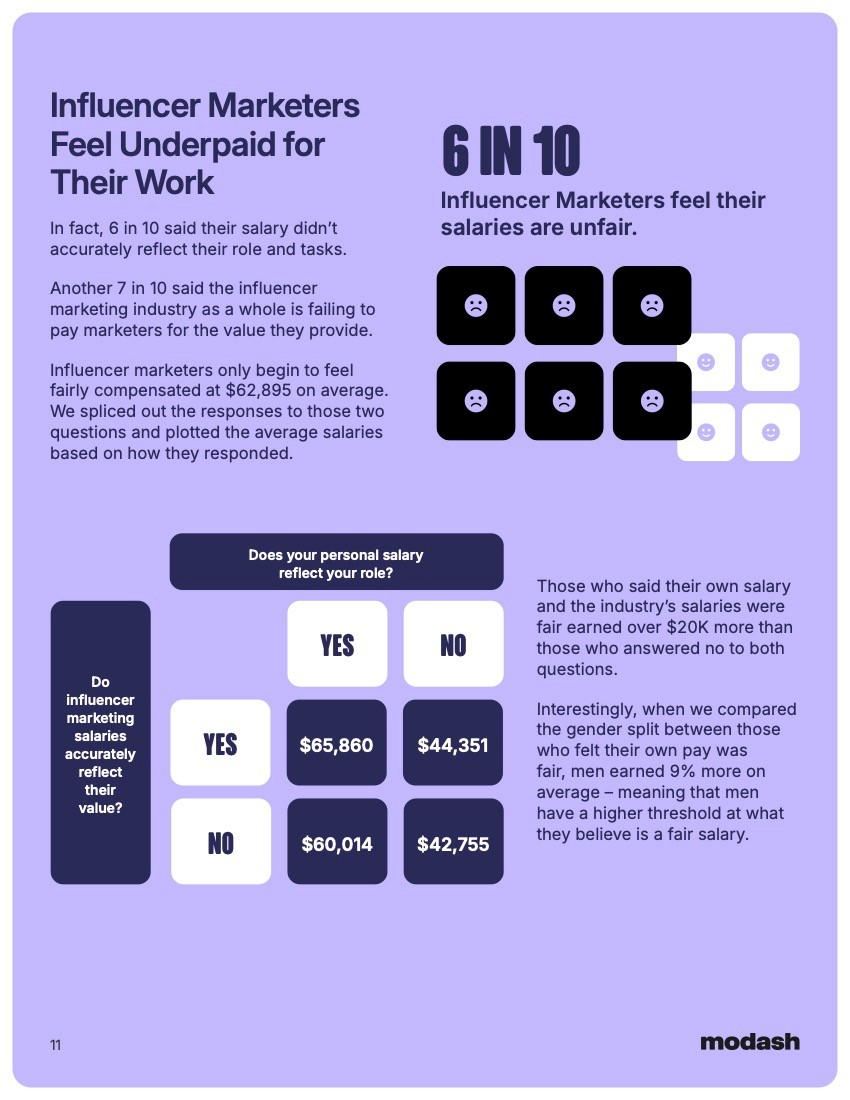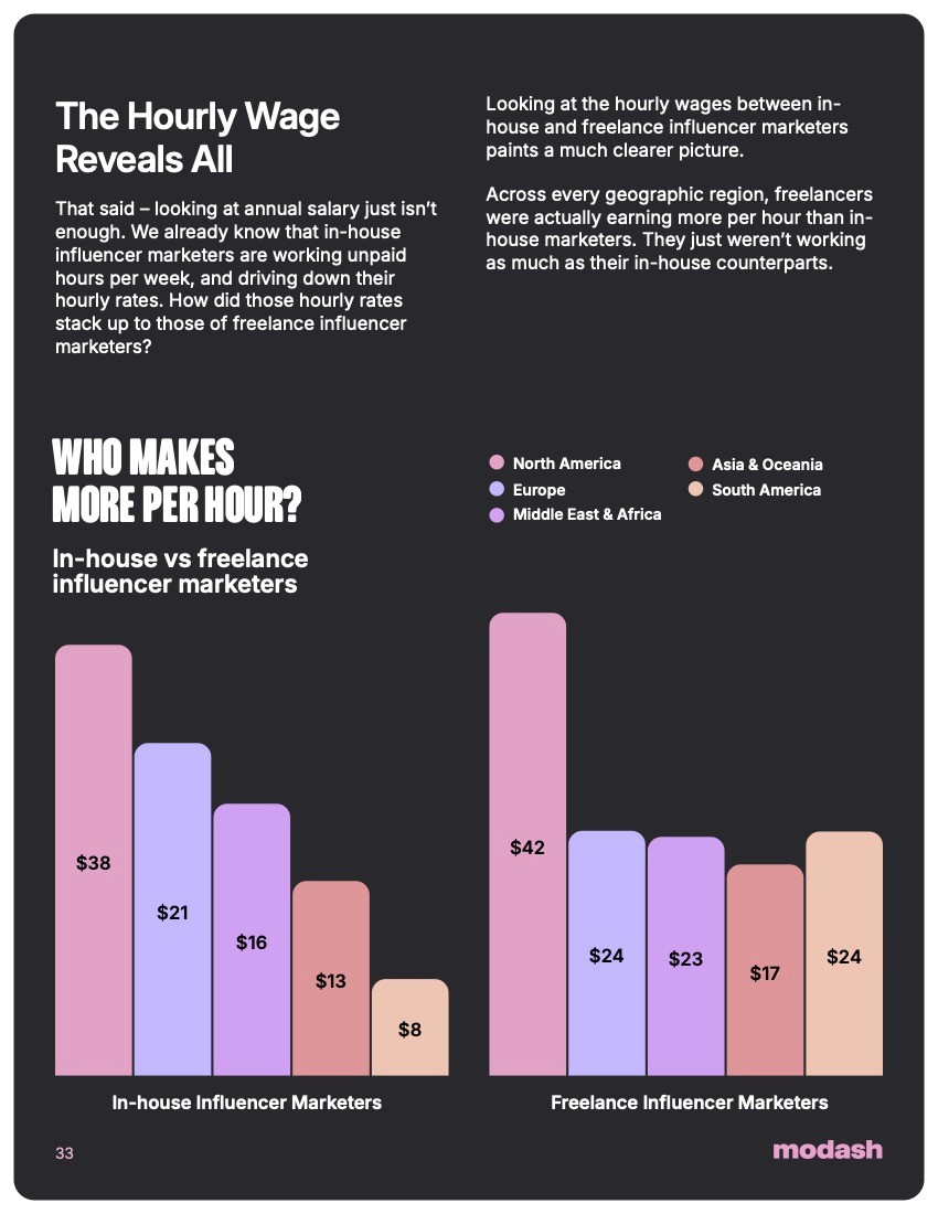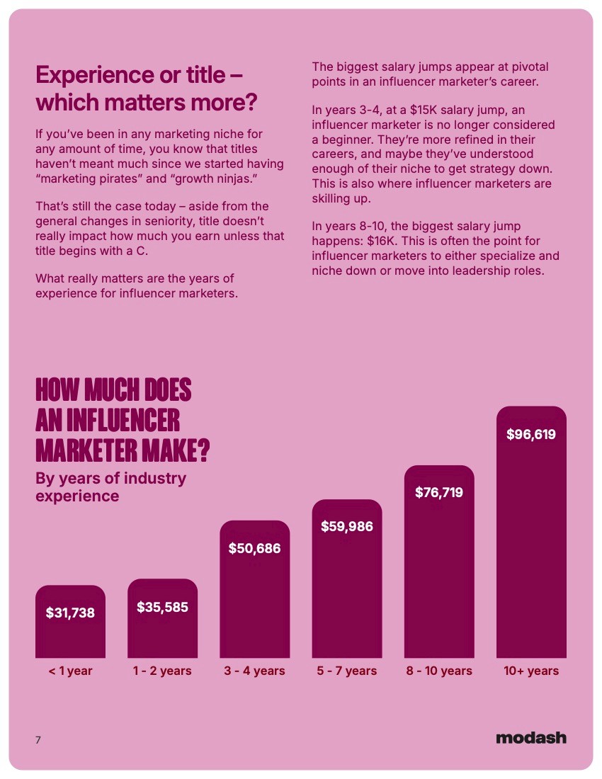 The report includes information on influencer marketers' salaries across different geographic regions, hierarchies, experience levels, expected tasks, and more. Its goal is to provide influencer marketers with benchmarks for their own salaries and suggest ways to increase their earnings in their current or next role.