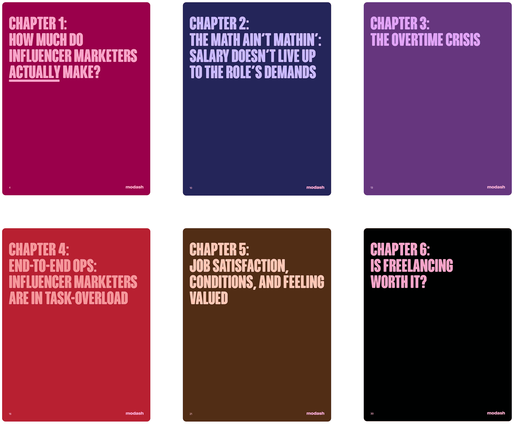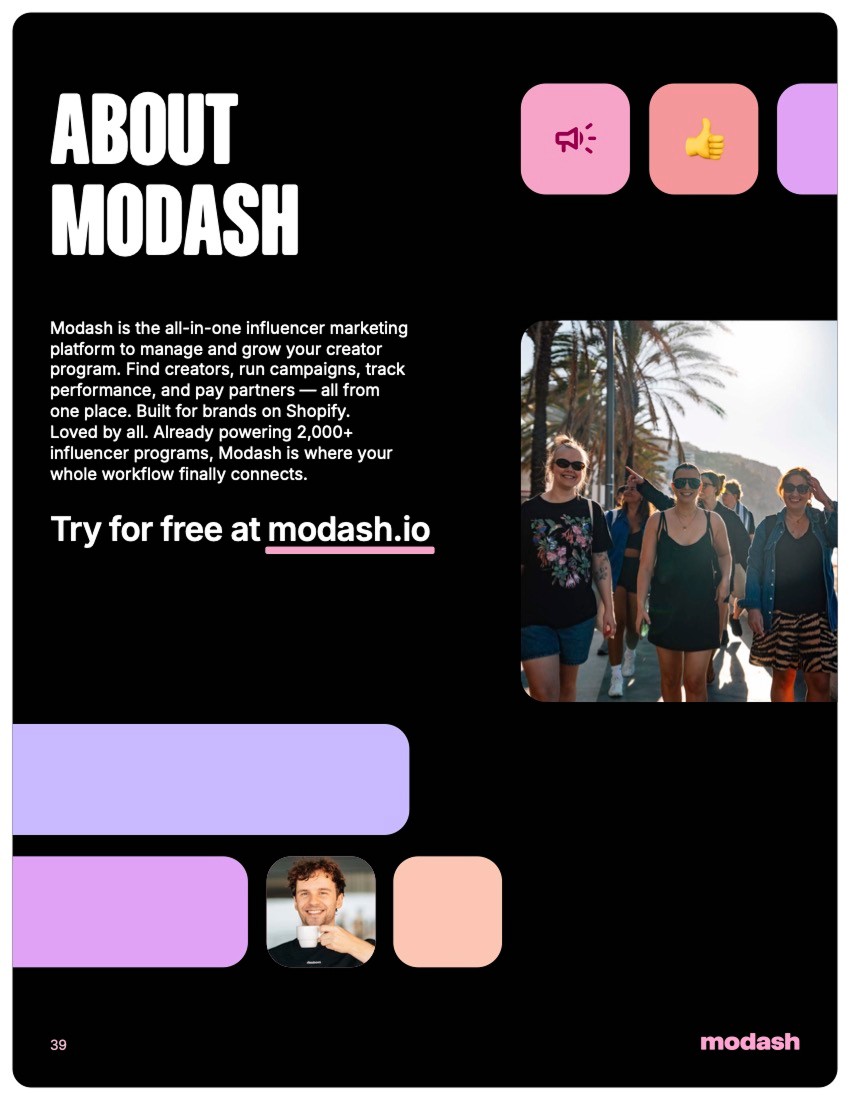 Modash is an all-in-one influencer marketing platform designed to manage and grow creator programs. The marketing team wanted to create a stylish, highly shareable, soft-gated PDF report that aligns with their branding.