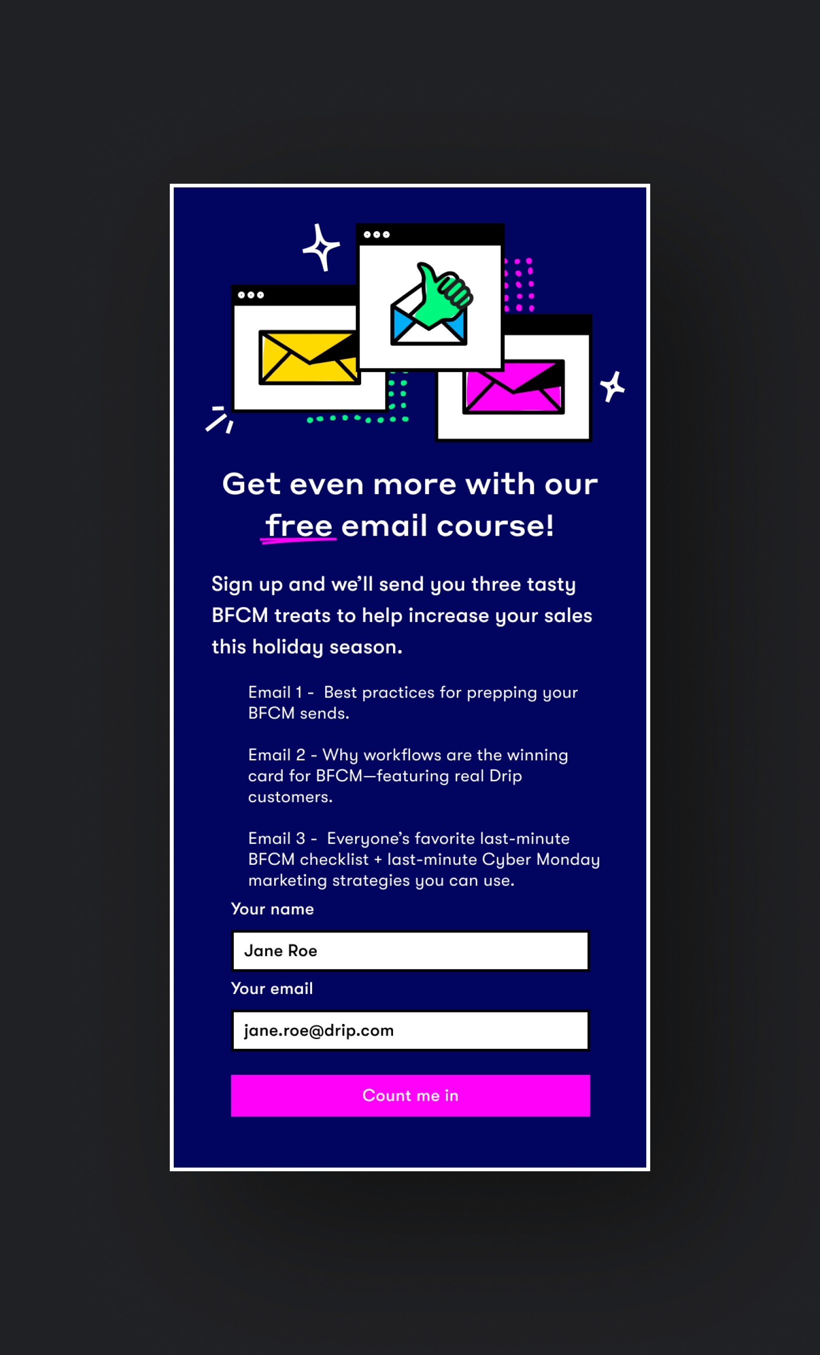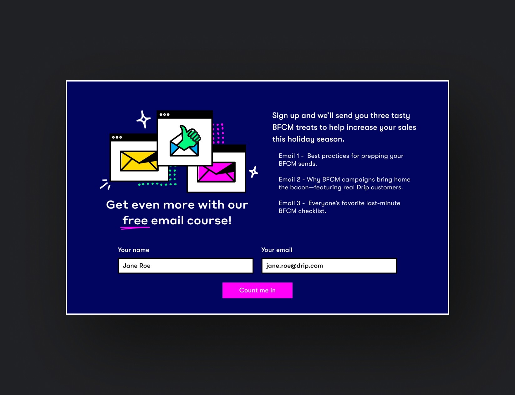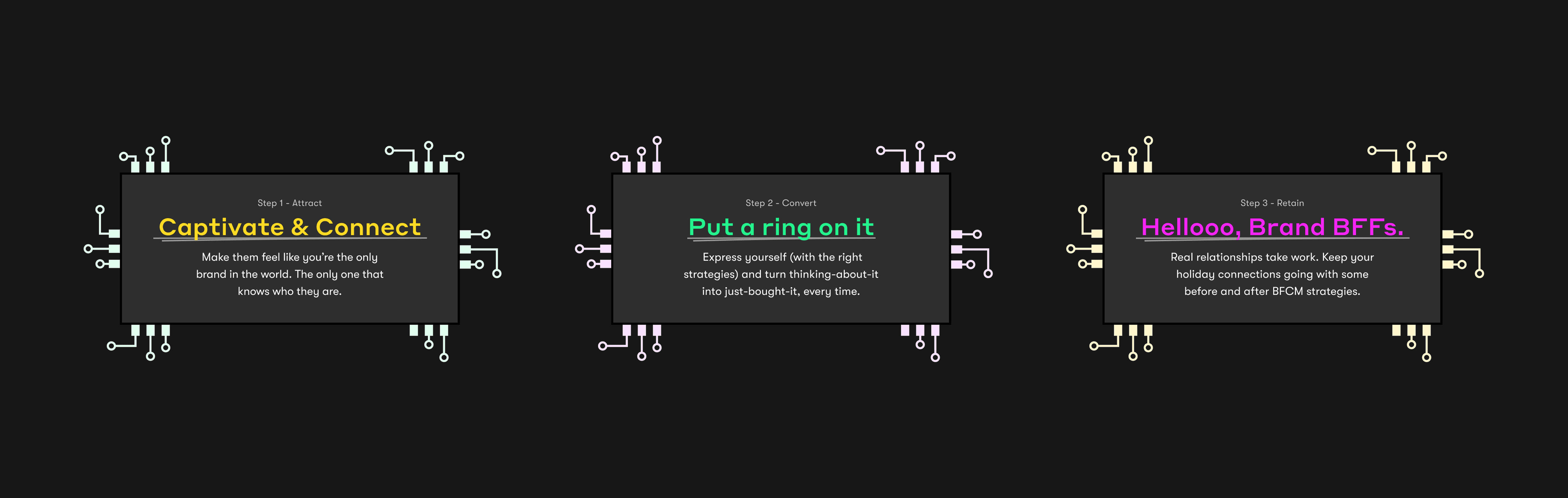 Every year, Drip launches a comprehensive resource center for Black Friday / Cyber Monday marketing strategies. I came up with the idea of blending the "journey through a motherboard" to play on Cyber Monday's technology theme, along with the steps needed for success.