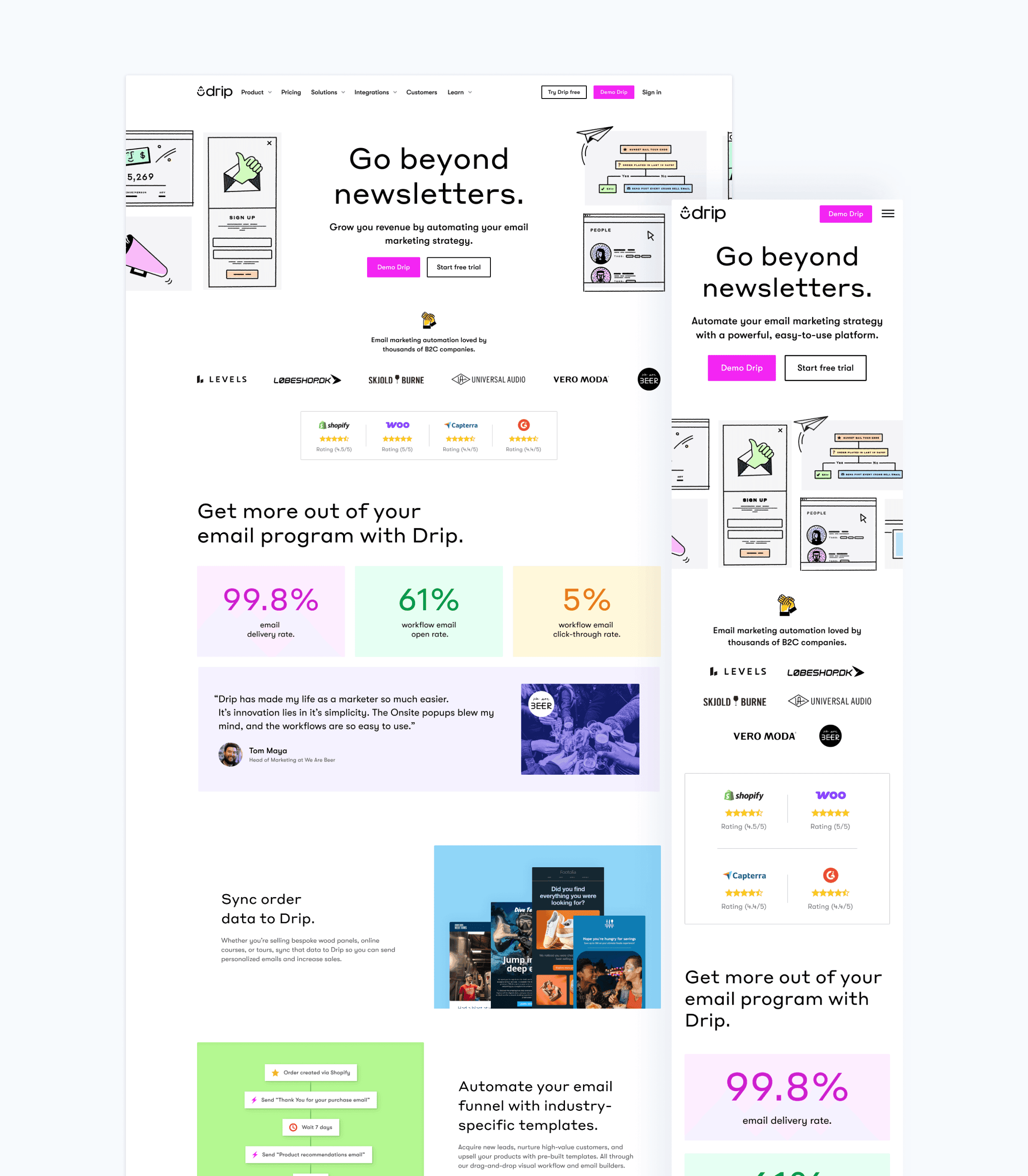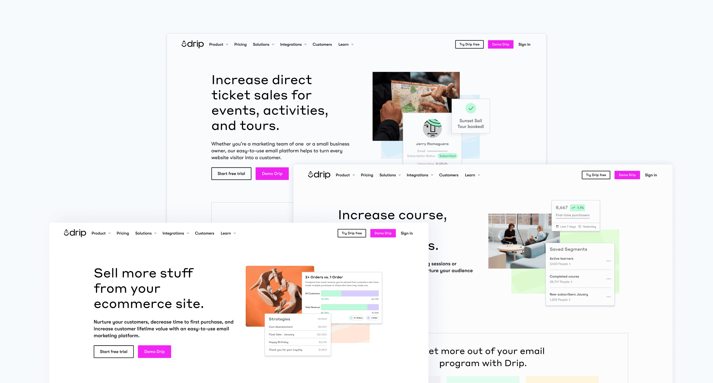 After refining the visual style and brand system, it was time to implement the new look across the Drip website. This involved updating the homepage, our navigation menus, product pages, industry pages, webinar templates, and more.