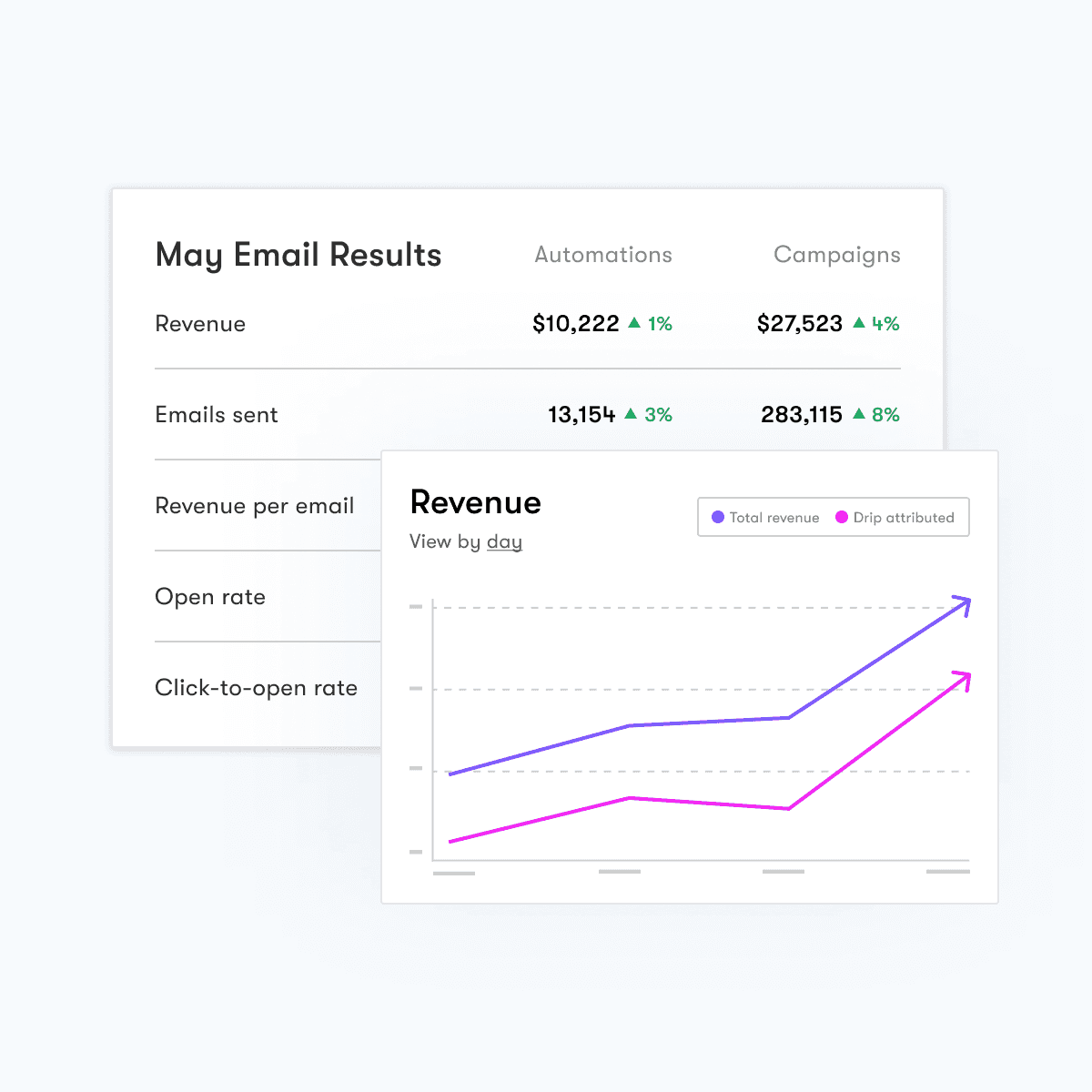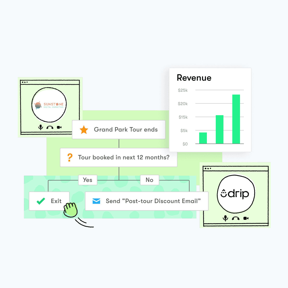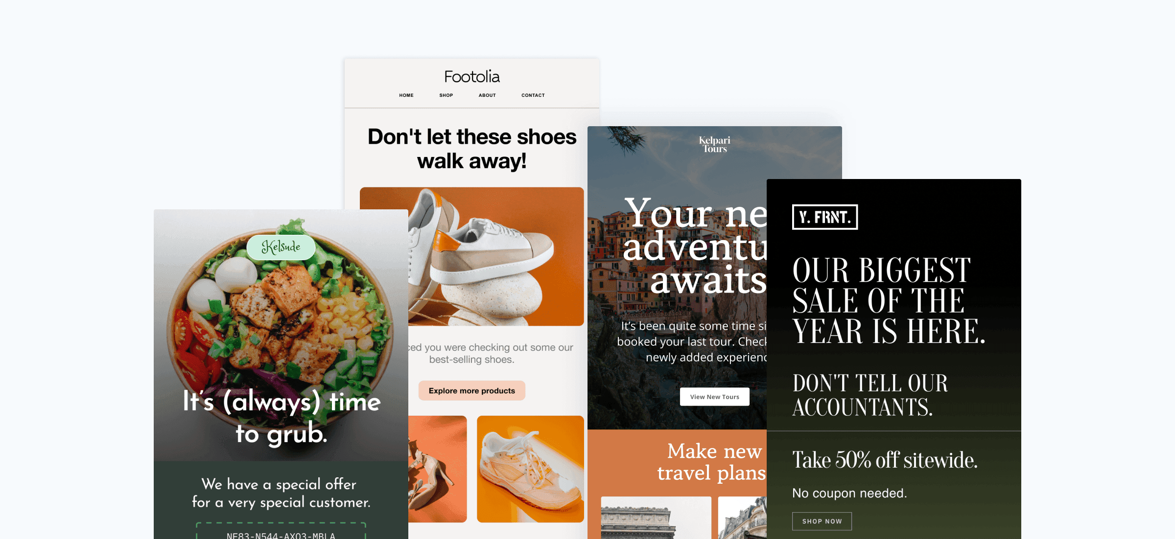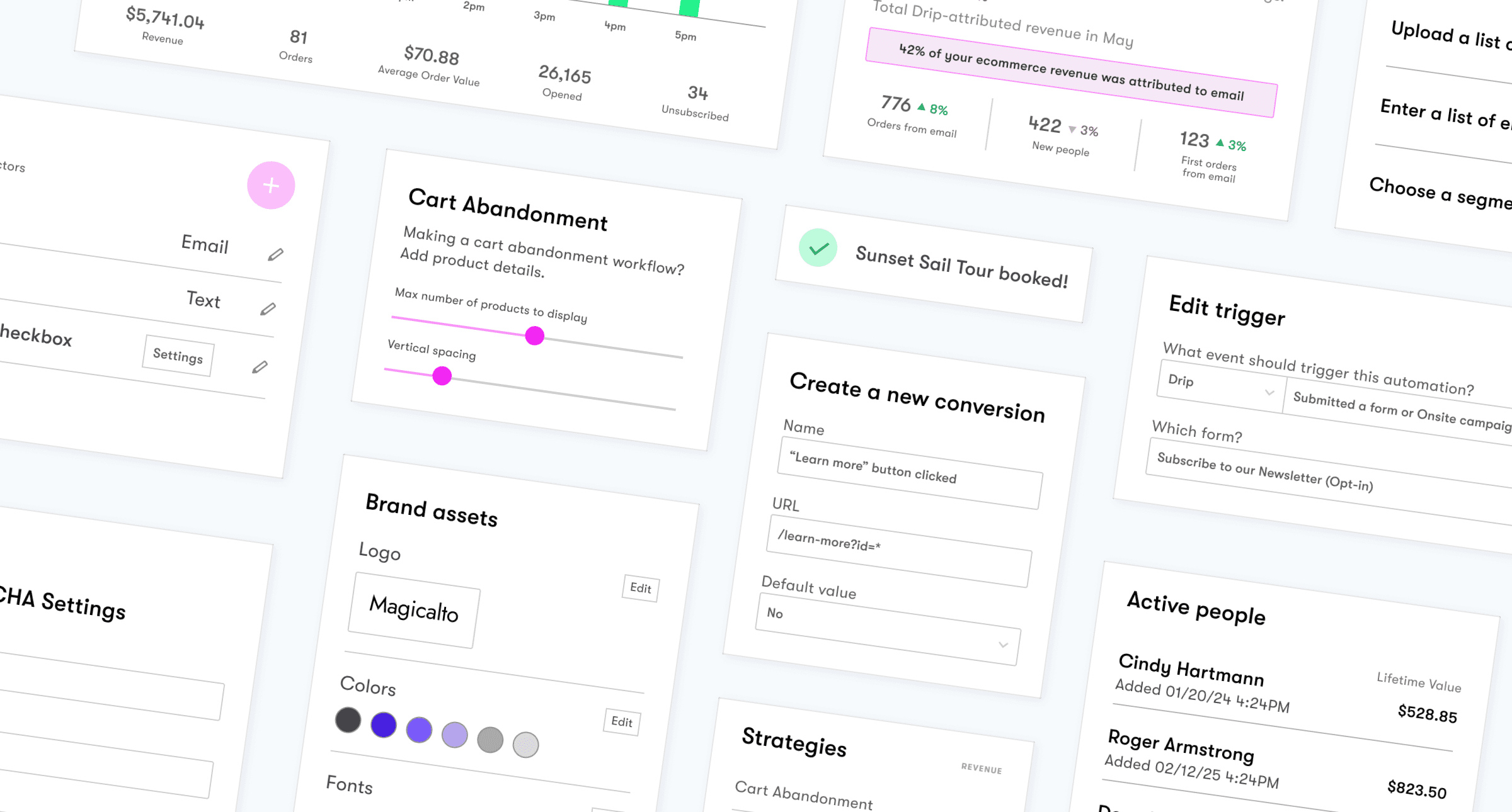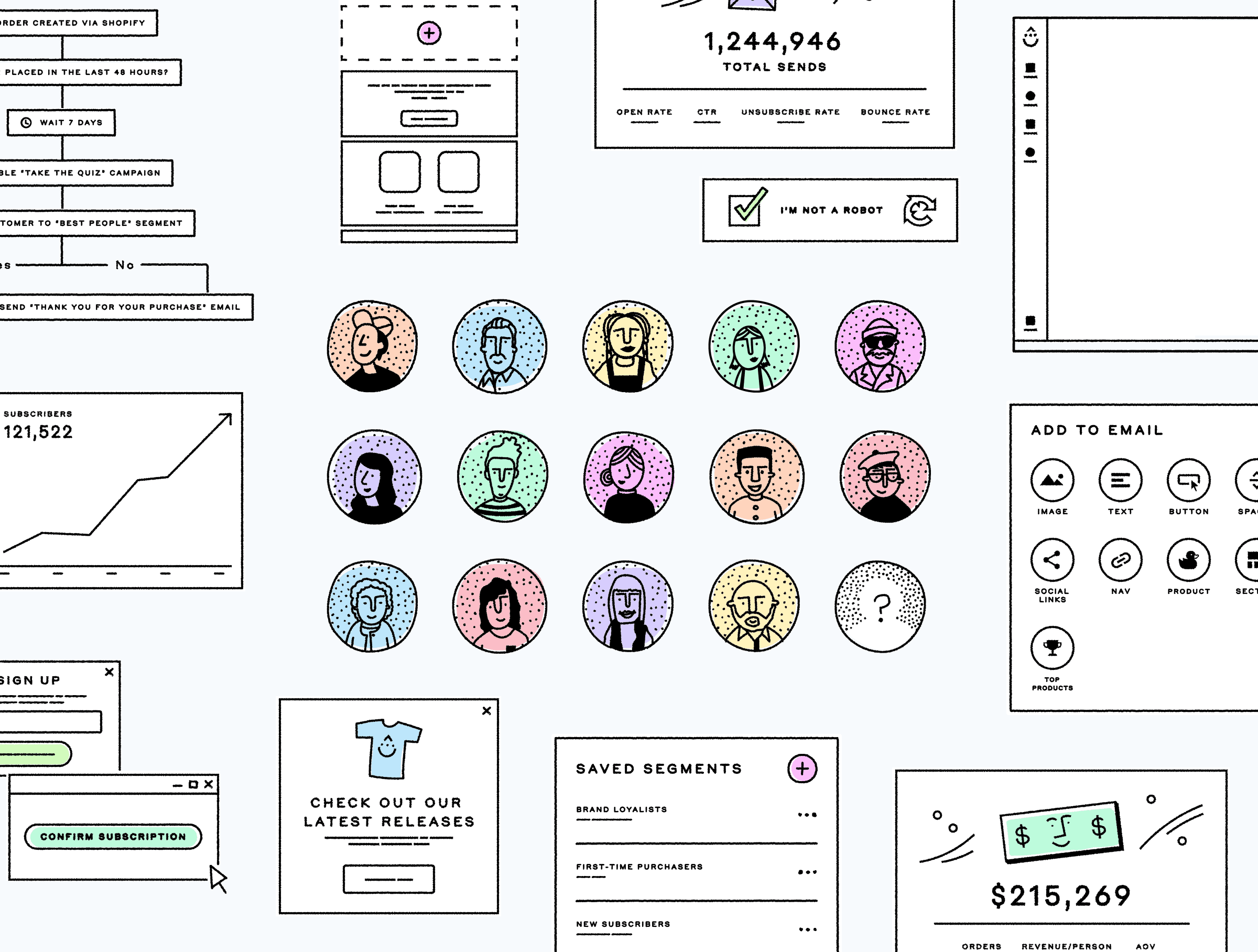 Since ballpoint pen hand drawings heavily influenced the new visual style, I added contrast and included real-life elements to provide context. I designed mock-up windows, charts, and lists inspired by the Drip user interface to blend with and overlap illustrations, clarifying the value of Drip's tools and features. Additionally, I created a library of mock email and onsite/popup form designs tailored for specific verticals and industries targeted through landing pages, ads, social media posts, and more.