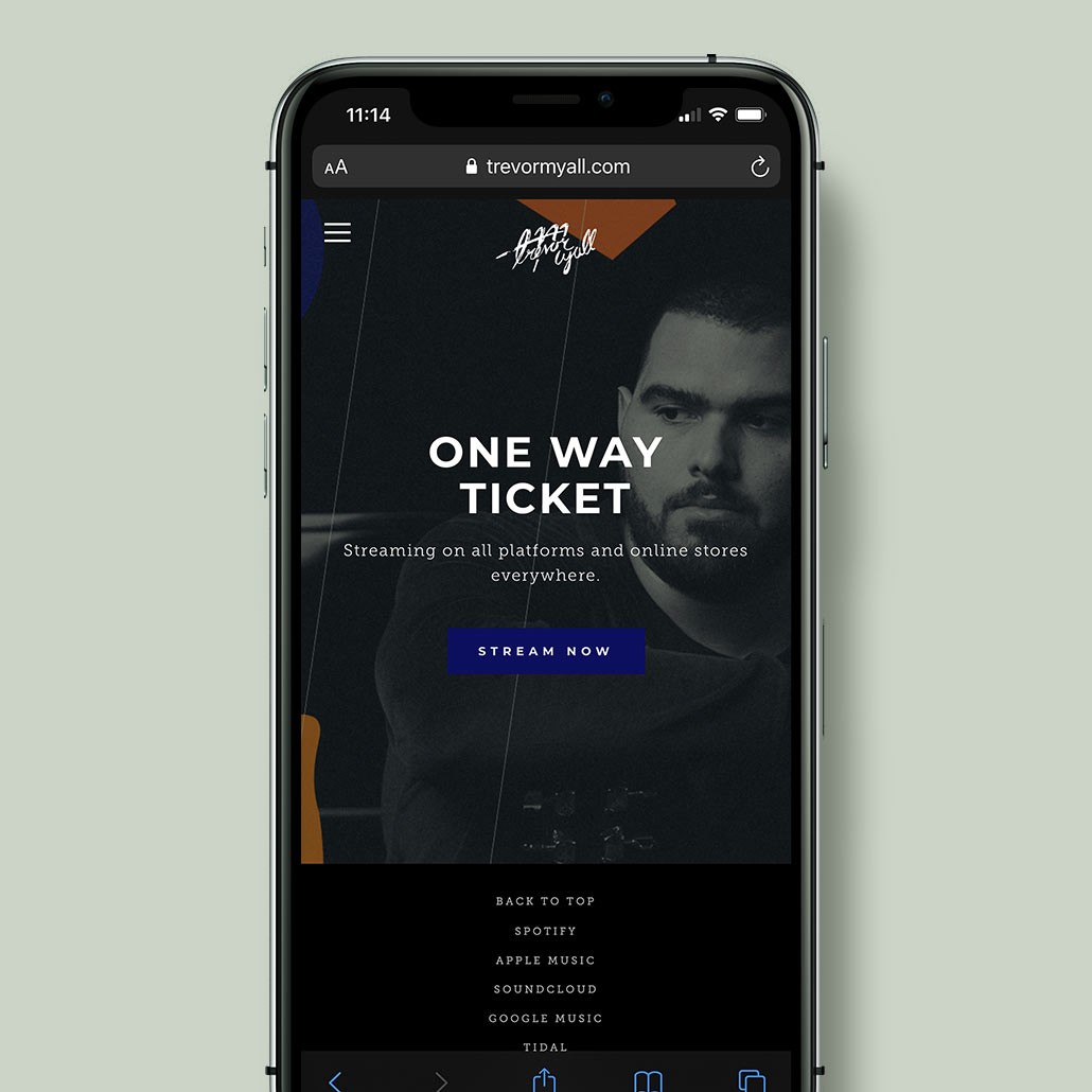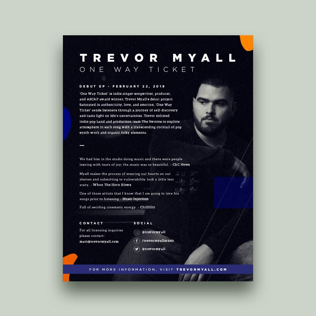 In addition to designing Trevor's covers, I also helped create his website, press one-sheeter, and social media graphics (posts and ads, banners and profile photos, etc.). The look and feel established on the EP and single covers were carried on to all other marketing materials to promote the project.